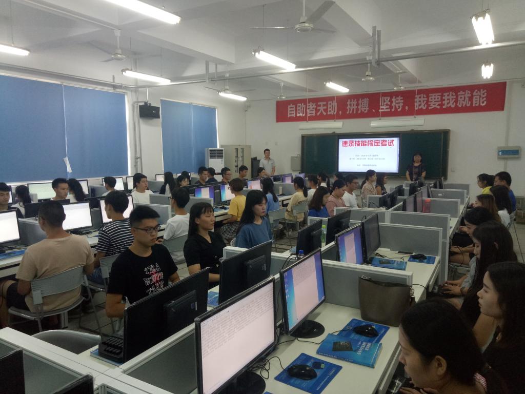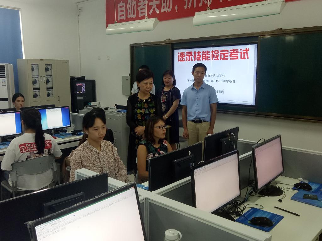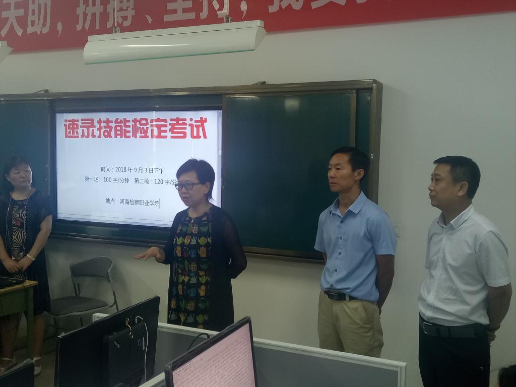 2018年9月3日下午,学院暑期亚伟中文速录技能检定考试在1119速录教室举行。学院副院长殷宏、检察系主任郑志锋、郑州加速度会议服务有限公司(简称加速度公司)总经理耿世昌以及暑期参加速录培训的教学、管理人员共同观摩了本次检定考试。