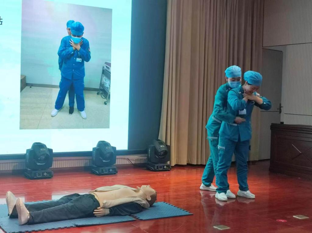 操作环节,医生现场进行示范演练。为了增强学生的现场参与感、即视感,讲座邀请了2名学生代表参与现场施救演练,医生在一旁逐一解答指导。同学们在仿真人体上演了心肺复苏技能和海姆立克急救法的实践练习。现场教学、亲身实践,给同学们留下深刻的印象,也更好的掌握了急救技能。